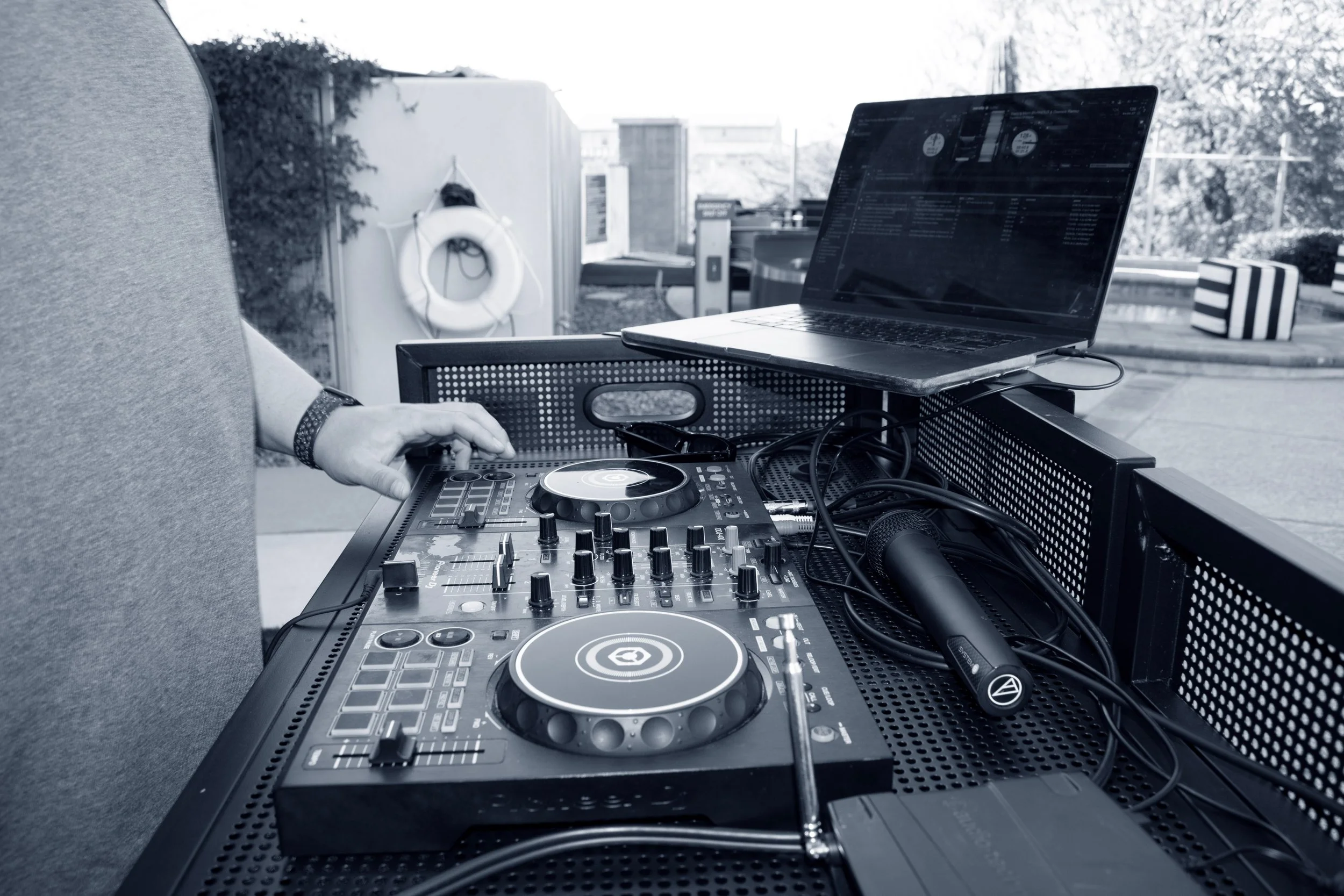 Equipment and setup are scaled to wherever the event is happening — pool deck, private villa, rooftop bar, or indoor venue. Production fits the space.